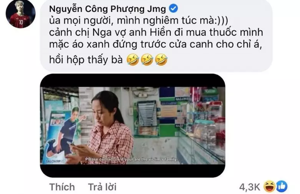 Thì ra anh xuất hiện trên tấm biển quảng cáo 1 sản phẩm được hiệu thuốc sử dụng đằng sau diễn viên Ốc Thanh Vân: “Ủa mọi người, mình nghiêm túc mà! Cảnh chị Nga (Ốc Thanh Vân vào vai) vợ anh Hiền đi mua thuốc, mình mặc áo xanh đứng trước cửa canh cho chị á, hồi hộp quá!”, anh hóm hỉnh bật mí.