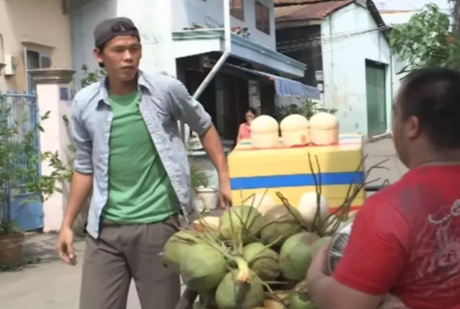Theo đó anh vào vai anh bán dừa dạo trên phố thì đụng độ cuộc đánh nhau. Anh thực hiện những pha bắt dừa, ném dừa điêu luyện kèm những câu thoại hài hước như: "Tướng cụt ngủn mà bày đặt đi xe cho cao!" và "Lùn mà lối hả? Mai mốt gặp xe dừa của tao là phải né nghe chưa!".
