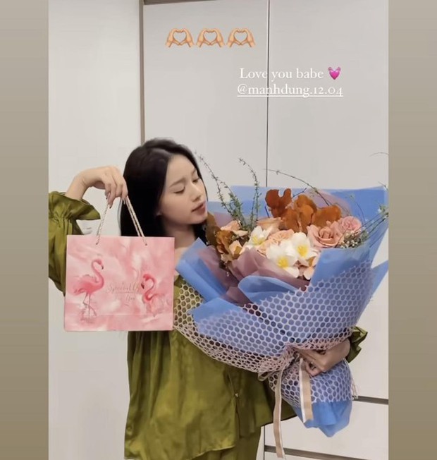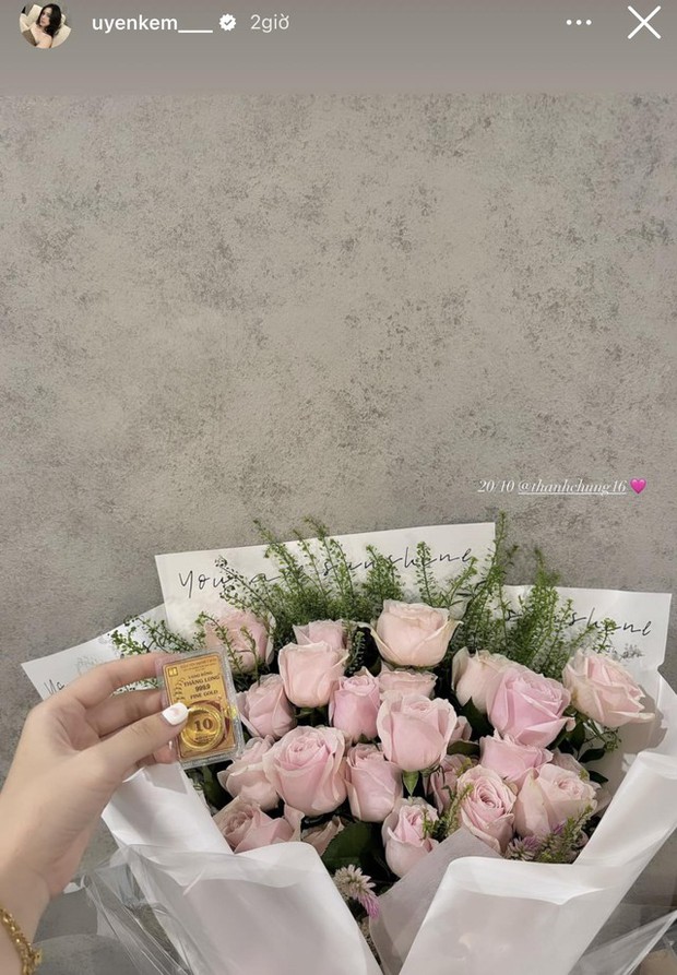 Trong khi đó hậu vệ Nguyễn Thành Chung lại chọn tặng hoa và nhẫn vàng cho vợ. Ngô Tố Uyên - vợ của Thành Chung hạnh phúc khoe món quà chồng tặng lên trang cá nhân.