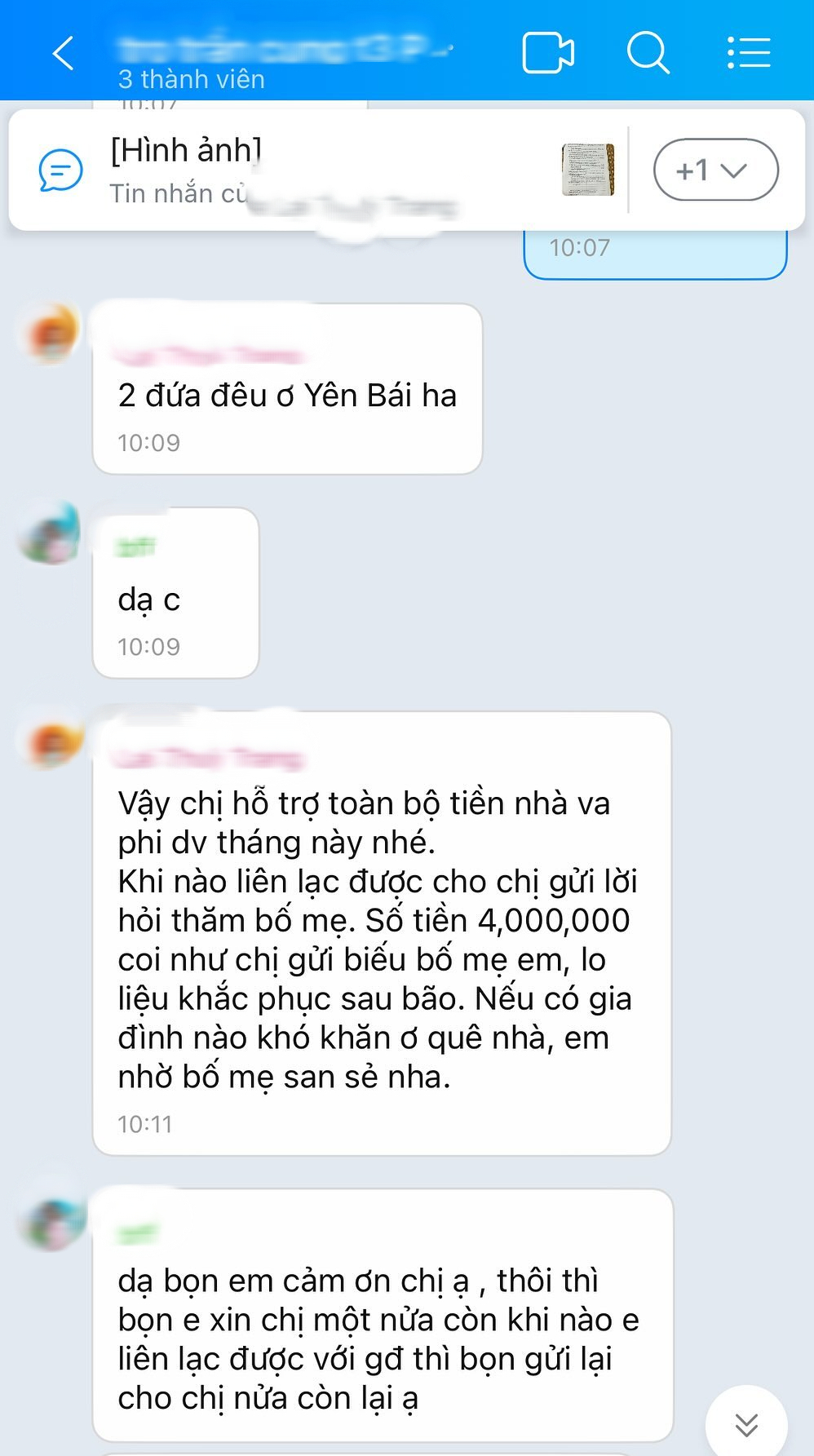 Tuy nhiên, khi nhận tin nhắn của cô bạn, chị chủ trọ đã liền hỏi thăm tình hình gia đình, khi biết được hai bạn cùng quê Yên Bái - nơi đang chịu ảnh hưởng của bão lũ, chị đã miễn phí tiền phòng, dịch vụ trong một tháng cho cả hai. “Vậy chị hỗ trợ toàn bộ tiền nhà và dịch vụ tháng này nhé.