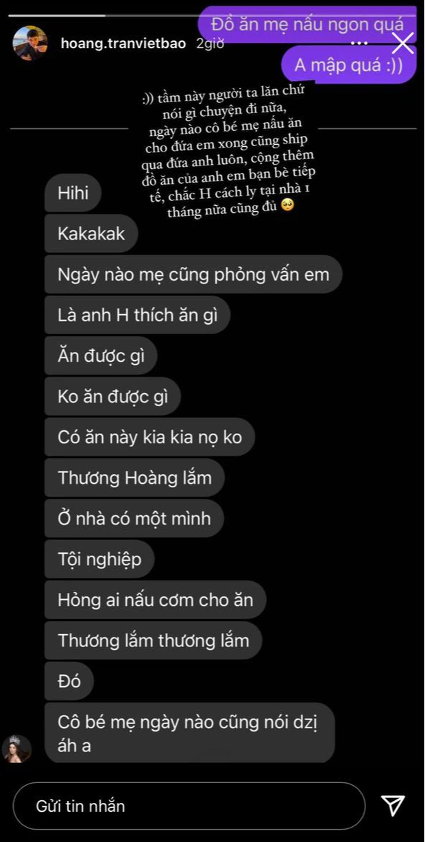 Thế nhưng, không chỉ thân thiết với Khánh Vân, Bảo Hoàng cũng rất được lòng gia đình cô nàng. Mới đây, Bảo Hoàng còn tung cả tin nhắn chứng minh mối quan hệ đặc biệt với mẹ nàng hậu.