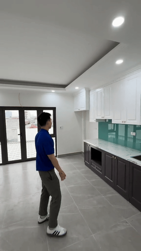Tầng 6 được chia thành 2 phòng nhỏ để có thể làm phòng kho, không gian thờ cúng. Gia đình Tun Phạm lựa chọn làm khu vực bếp và phòng ăn ở trên tầng 7 - tầng cao nhất trong nhà. Bên cạnh đó là ban công rộng, view nhìn ra thành phố có thể trồng cây, làm vườn vì diện tích thoáng. Hiện căn nhà mới hoàn thiện, sắp tới sẽ làm nội thất và dự định hoàn tất vào cuối tháng để chuyển về ở.