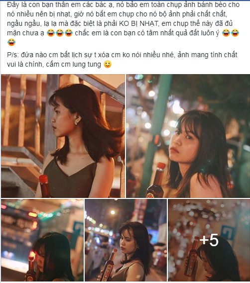 "Đây là con bạn thân em các bác ạ, nó bảo em toàn chụp ảnh bánh bèo cho nó nhiều nên bị nhạt, giờ nó bắt em chụp cho nó bộ ảnh phải chất chất, ngầu ngầu, lạ lạ mà đặc biệt là phải "không bị nhạt", em chụp thế này đã đủ "mặn" chưa ạ. Chắc em là con bạn có tâm nhất quả đất luôn ý".