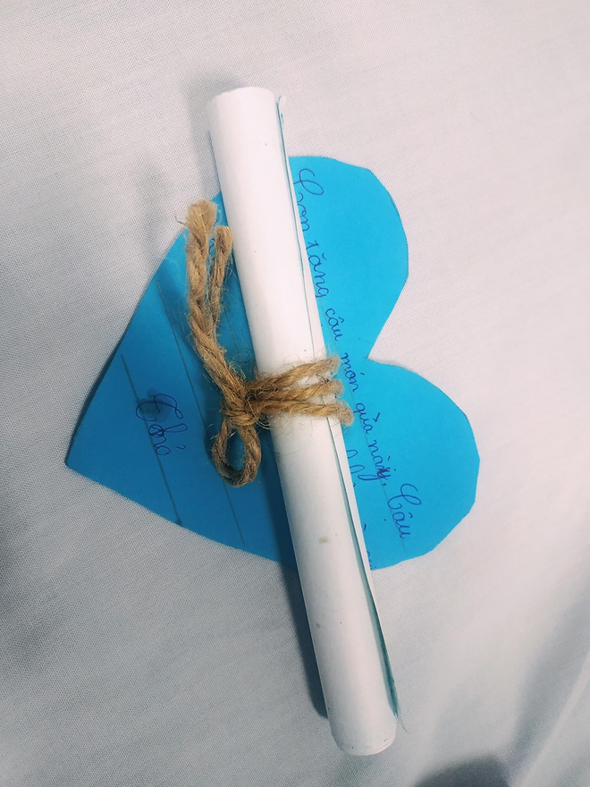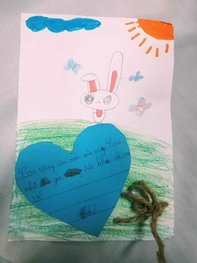 "Mình muốn kể về "bát cháo hành" dễ thương của cháu mình. Bé Thỏ là con của chị gái mình, mới vào lớp một thôi, nét chữ có thể còn nghệch ngoạc, cắt dán lem nhem, câu văn có thể chẳng cần hoa mỹ... Nhưng em bé đã vẽ tặng cậu bức tranh kèm lời nhắn nhủ dễ thương: "Con tặng cậu món quà này. Cậu nhớ giữ gìn sức khỏe và vui vẻ!"