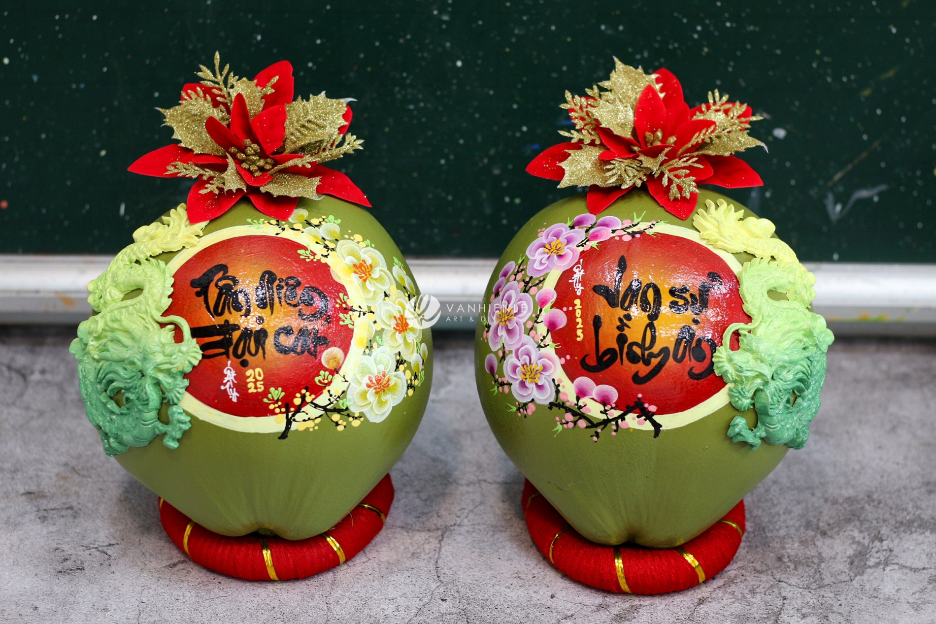 Sau khi có quả dừa chất lượng, Hiền xịt một lớp sơn theo mong muốn của khách hàng. Tiếp đó, Hiền vẽ hình tròn tâm và ghi chữ thư pháp, rồi đính phôi rồng đã sơn sẵn và hoa đất sét lên dừa.