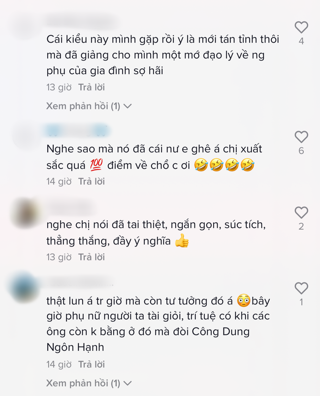 Để bảo vệ quan điểm của mình, Tiến Nguyễn đáp lại rằng một người phụ nữ có đầy đủ công dung ngôn hạnh luôn rất tốt đối với anh. "Dù em có là phụ nữ hiện đại đi nữa thì em vẫn phải biết bếp núc. Em không cần nấu ngon, em chỉ cần nấu được thôi".