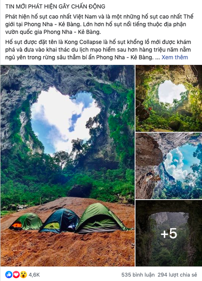 Tuy nhiên, một số fanpage lớn trên Facebook liên tục đưa "tin mới phát hiện gây chấn động" khi Việt Nam vừa phát hiện ra hố sụt cao nhất thế giới nằm trong địa phận vườn quốc gia Phong Nha – Kẻ Bàng.