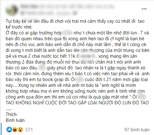 Tuy nhiên, đối với một số người, buổi hẹn hò đầu tiên không những không để lại kỷ niệm đẹp mà nó còn là nỗi ám ảnh khiến họ mất dần niềm tin vào việc tìm được nửa kia. Điển hình như trường hợp "cay đắng" nhớ đời của cô gái trong bài.