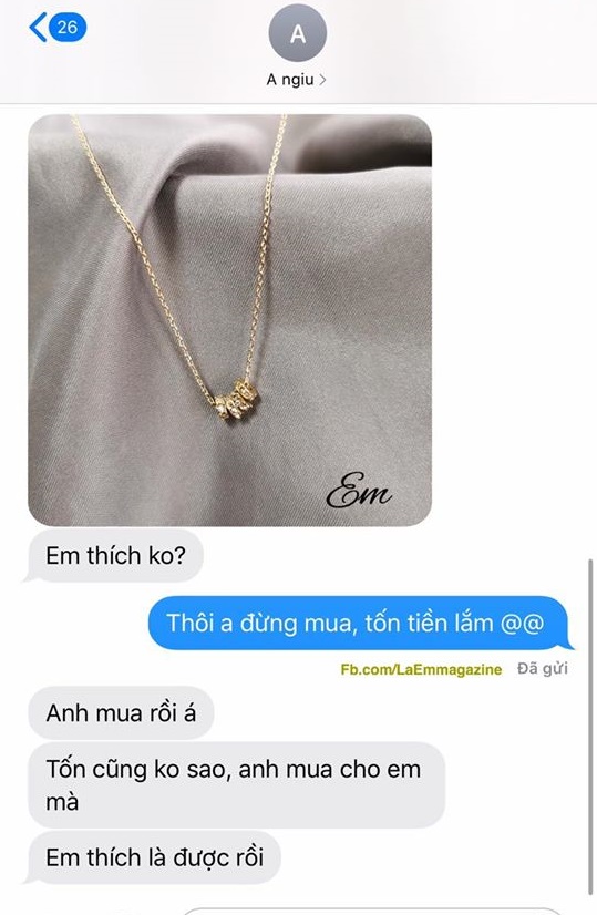 Mới đây, một dân mạng đăng tải bài viết khoe về chuyện người yêu tặng dây chuyền vàng. Cô nàng tỏ ra ngại ngùng và lo sợ tốn kém, bảo người yêu đừng mua. Ngay lập tức, chàng người yêu đáp lại: