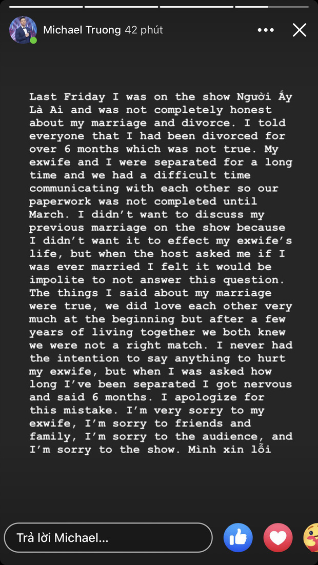 Trước những tin đồn không hay về mình, Michael quyết định lên tiếng thông qua story FaceBook cá nhân. Theo đó, anh chàng thừa nhận việc nói đã ly hôn 6 tháng trên show là không đúng.