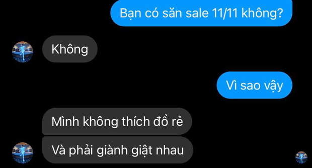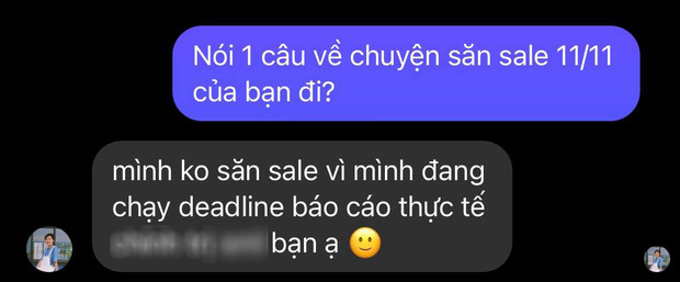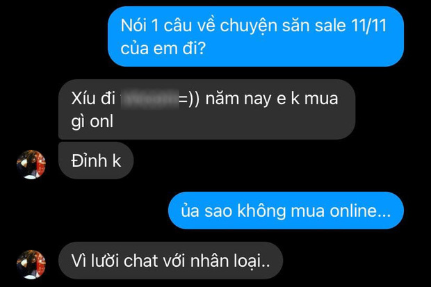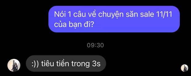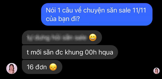 Chốt đơn xong, ngay lập tức phải hỏi tình hình chung của các chị em mình trong ngày hội như này mới được: "Nói một câu về chuyện săn sale 11/11 của bạn đi?"