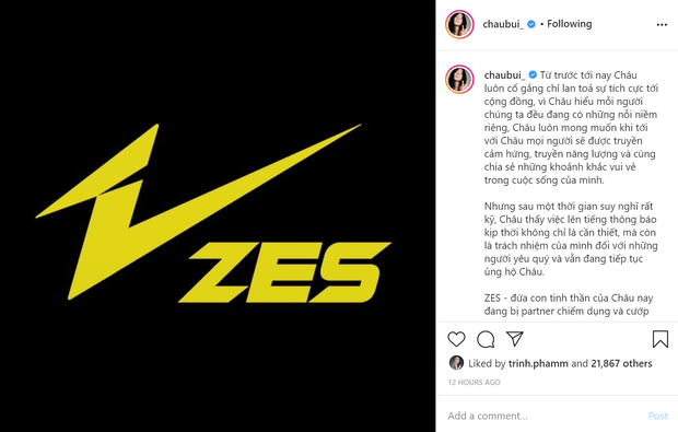 "Hình ảnh của Châu cùng bạn bè mình đã và đang bị tự ý sử dụng cho mục đích thương mại hoặc những mục đích khác, Châu hoàn toàn bị tước mất quyền kiểm soát về hệ thống vận hành, sản phẩm cũng như hình ảnh. Những nội dung và hoạt động trên 2 trang Facebook và Instagram chính thức của ZES trong những ngày gần đây được đăng tải cũng không hề được thông qua hay có sự đồng ý của Châu. Về phần cá nhân Châu không thể liên lạc với partner trong công ty của mình", Châu Bùi viết.