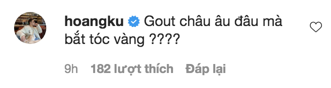 Ẩn ý trong caption thì chưa bàn tới nhưng sự chú ý của dân tình đổ dồn hết vào màu tóc mới của Châu Bùi. Đặc biệt hơn, Hoàng Ku - người bạn thân của Châu Bùi có dòng "cà khịa" cực "gắt": "Gout châu Âu đâu mà bắt tóc vàng?". Câu bình luận của chàng stylist khiến nhiều người không khỏi thích thú và nhớ lại, cách đây không lâu, Binz đã cùng Châu Bùi có màn tung hứng cực kỳ ăn ý.