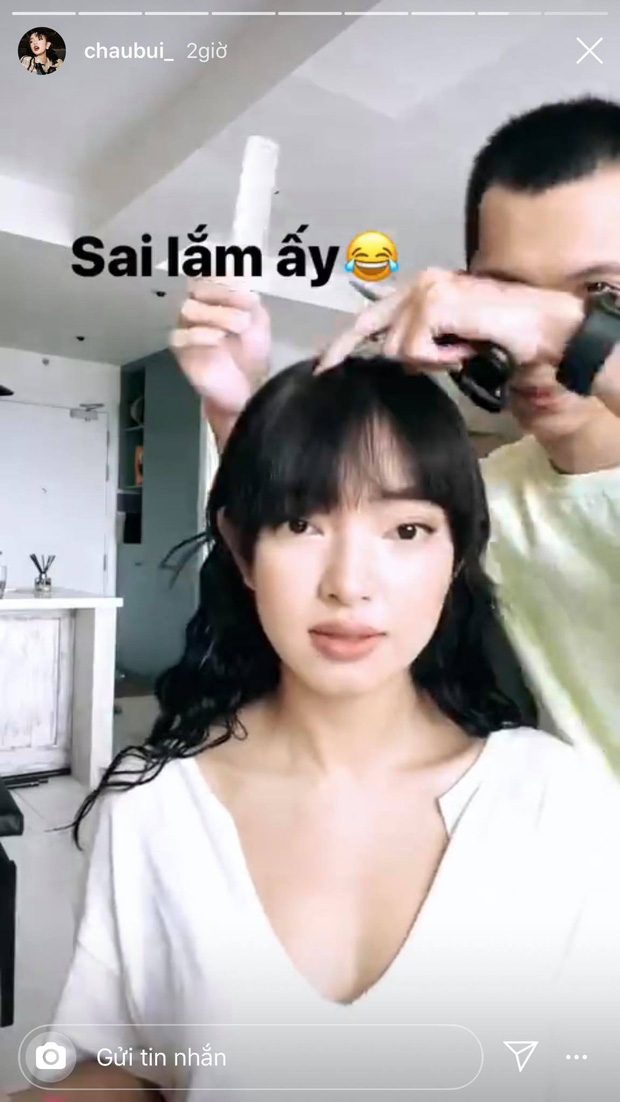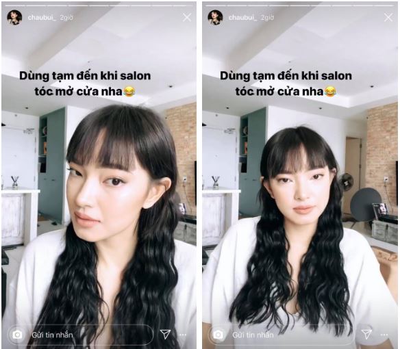 Vì tóc mái đã dài qua cả mắt nhưng vẫn nghiêm túc thực hiện cách ly xã hội nên Châu Bùi đã quyết định tự xử luôn tại nhà. Nhưng cô không tự cắt mà đã nhờ một người bạn với cây kéo thông thường cắt cho.