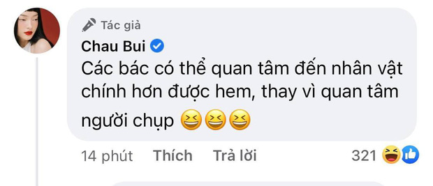 Trước hàng loạt bình luận như vậy, Châu Bùi đành phải lên tiếng. Dù ảnh đã đăng từ 31/3 nhưng tối qua (2/4), cô nàng đã vào comment đòi công bằng: "Các bác có thể quan tâm đến nhân vật chính hơn được không, thay vì quan tâm người chụp".