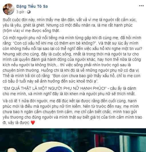 "Suốt cuộc đời này, nhìn thấy mẹ lận đận, vất vả vì mẹ là người rất cảm xúc, yêu là yêu, ghét là ghét. Nhưng có một điều nhận ra, là mẹ rất hạnh phúc (trộm vía) vì mẹ được sống thật.
