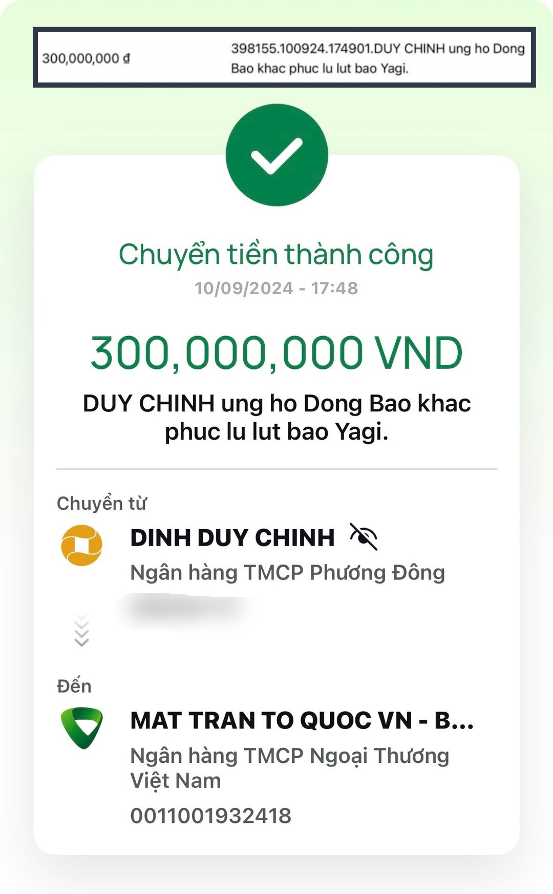 Đó là Quang Linh Vlogs đại diện cho cộng đồng team Châu Phi ủng hộ 300 triệu đồng với nội dung chuyển khoản "Cộng đồng team Châu Phi ủng hộ khắc phục bão số 3 Yagi".