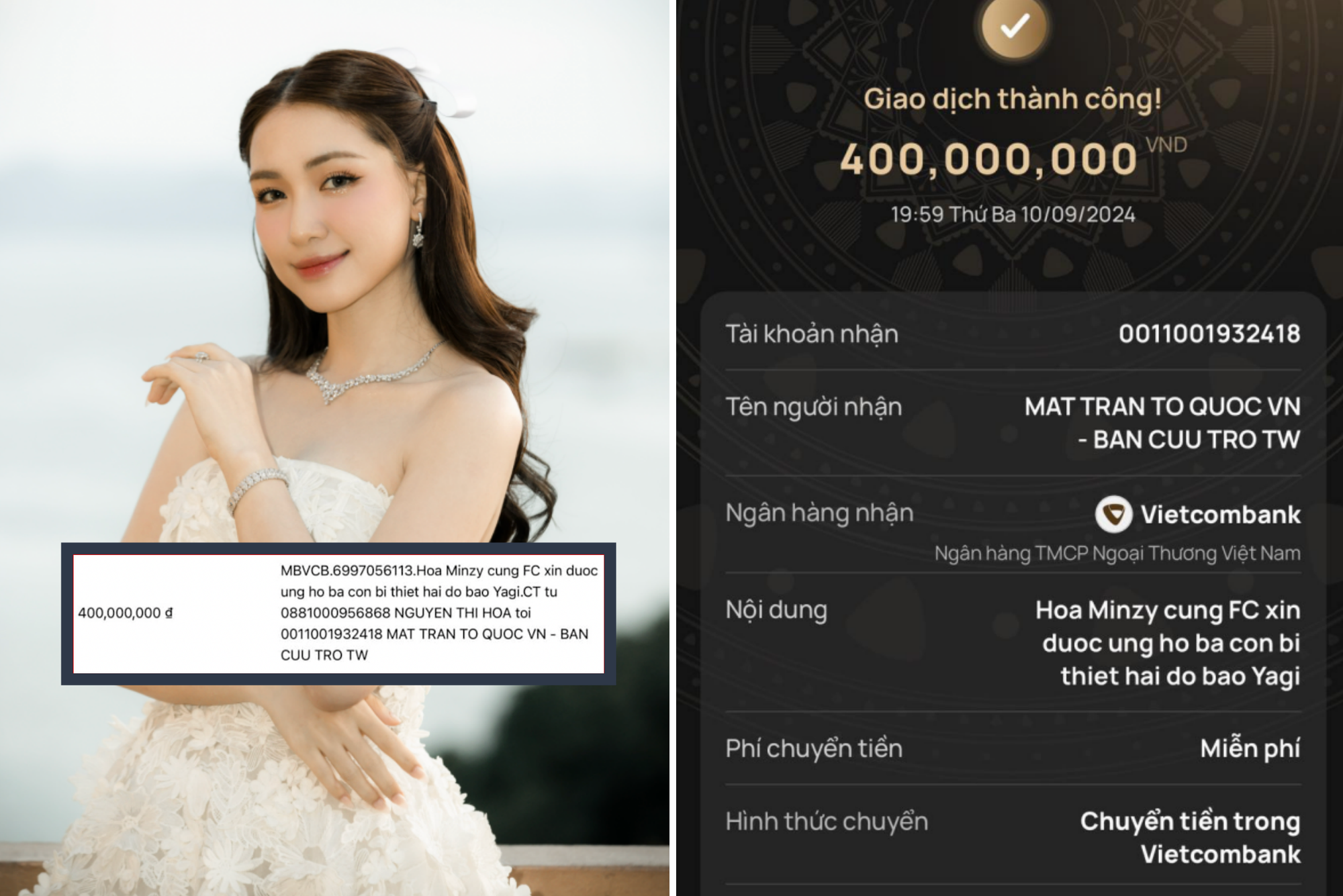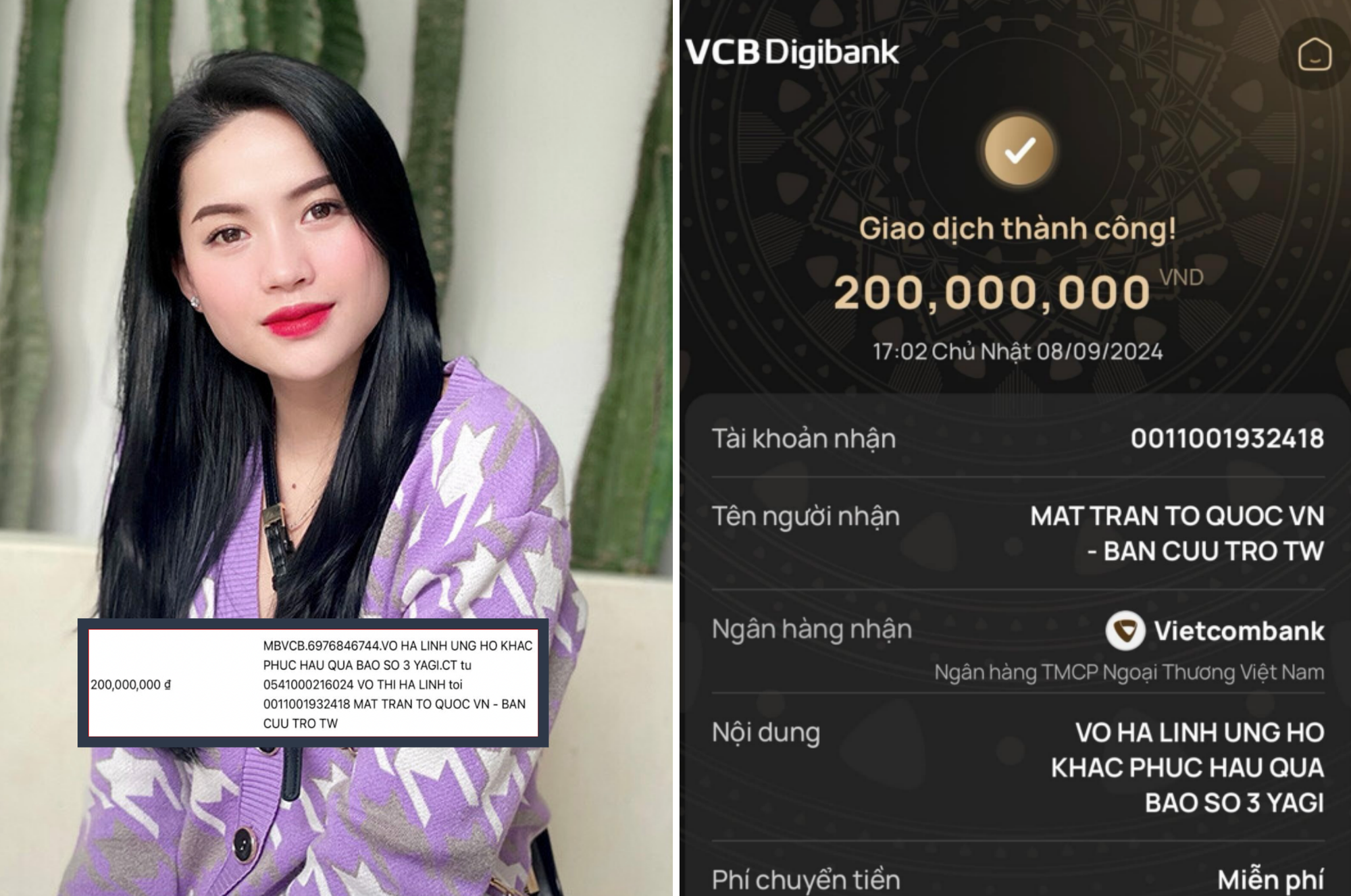 Đó là Hà Linh với màn ủng hộ 200 triệu đồng với nội dung chuyển khoản: "Võ Hà Linh ủng hộ khắc phục hậu quả bão số 3 Yagi". Sau đó, công ty của Hà Linh tiếp tục ủng hộ 1 tỷ đồng cho Uỷ ban Mặt trận Tổ Quốc TP.HCM.