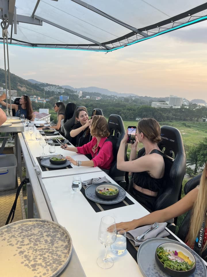 Trải nghiệm ăn uống này đã có mặt tại hơn 40 quốc gia. Với hàng ghế dành cho 20 - 22 người ngồi xung quanh một bàn ăn có sẵn bếp, mái che, được kéo lên cao bởi hệ thống cần cẩu lớn lắp đặt tại vị trí chỉ định. Điểm đặc biệt là nhà hàng ở Dubai có view hướng ra quần đảo Cây Cọ với hàng trăm chiếc du thuyền hạng sang neo bên bờ khá đẹp.