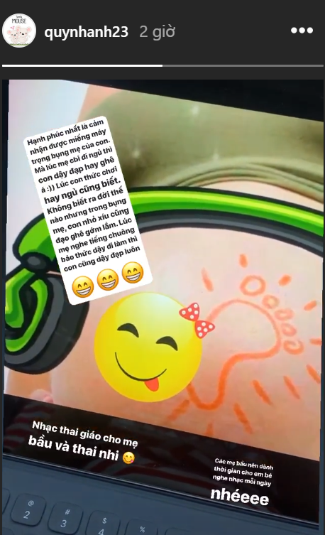 Bên cạnh đó, Quỳnh Anh cũng có động thái mới đó là chia sẻ việc đang nằm thư giãn và cho bé con trong bụng của cô nghe nhạc. Có thể thấy tâm trạng của công chúa này ổn định hơn. Mọi người cũng vì thế mà bớt lo lắng cho cô.