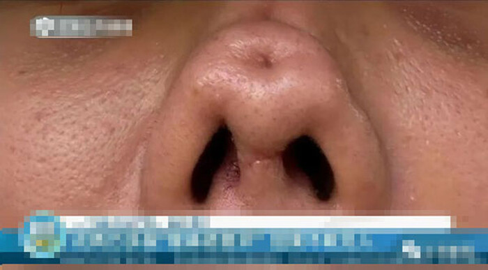 Nhưng sau khi dịch được hút hết ra ngoài, vấn đề mới lại xuất hiện. Tiểu Trần cho biết, sụn giả của cô bị vênh lên khi dùng tay nhấn vào khoảng giữa lông mày. Sau đó, sụn giả tuột xuống và đâm vào đầu mũi như muốn xuyên ra ngoài.