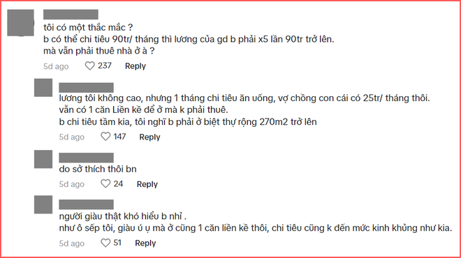 Có thể thấy trong phần chia sẻ của bà mẹ này, tổng thu nhập của gia đình là thứ không được nhắc tới. Tuy nhiên với mức chi tiêu 90 triệu/tháng, nhiều người cho rằng nguồn tiền vào của gia đình cũng phải ở mức vài trăm triệu/tháng.