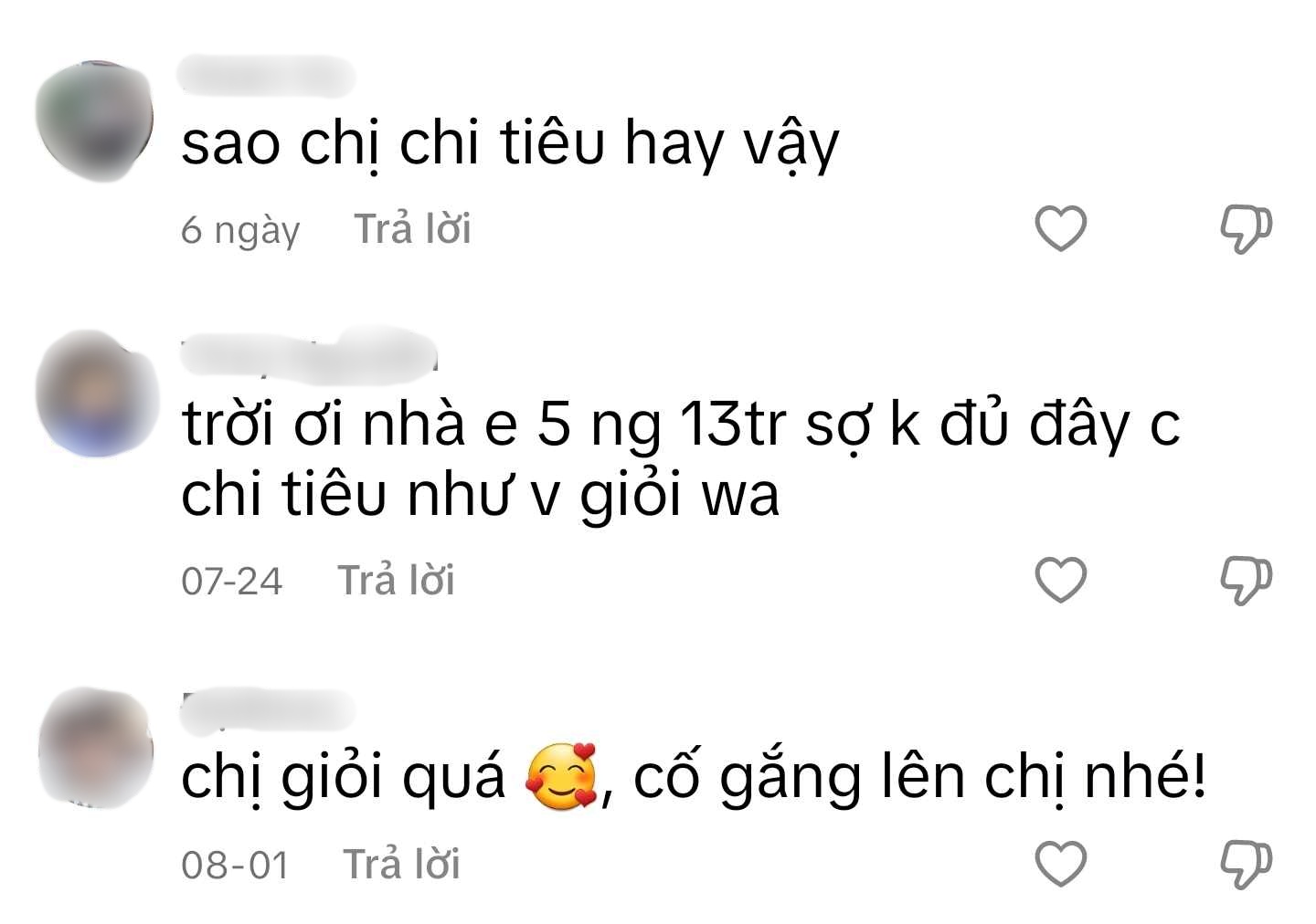 Dân tình cũng để lại nhiều bình luận động viên chủ kênh TikTok này và cho rằng chi tiêu chưa đến 6 triệu/tháng cho gia đình 6 thành viên là đã quá khéo vun vén rồi.