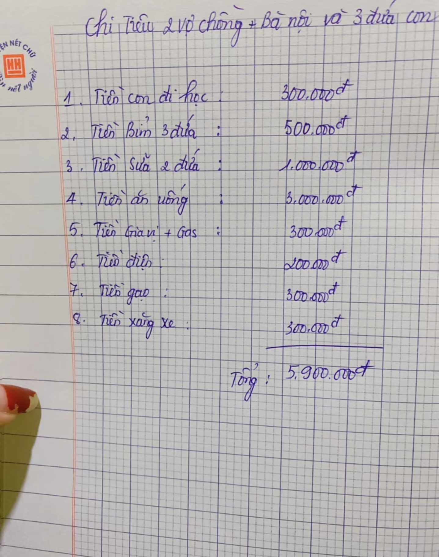 Cụ thể, tổng chi tiêu 1 tháng cho gia đình cô là 5,9 triệu với các khoản chi như sau: