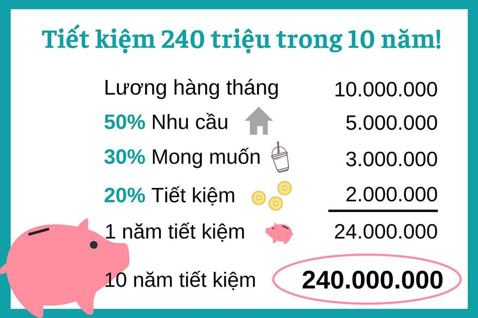 Theo đó, 50% (5 triệu) sẽ dành để chi trả cho các khoản phí và chi tiêu trong gia đình, điện nước, tiền nhà các kiểu; 30% (3 triệu) sẽ dành cho nhu cầu cá nhân ăn uống, cà phê với bạn bè,...; còn lại 20% (2 triệu) tất nhiên là sẽ để tiết kiệm. Cứ thế, đều đặn 10 năm ai cũng sẽ có 240 triệu tiết kiệm.