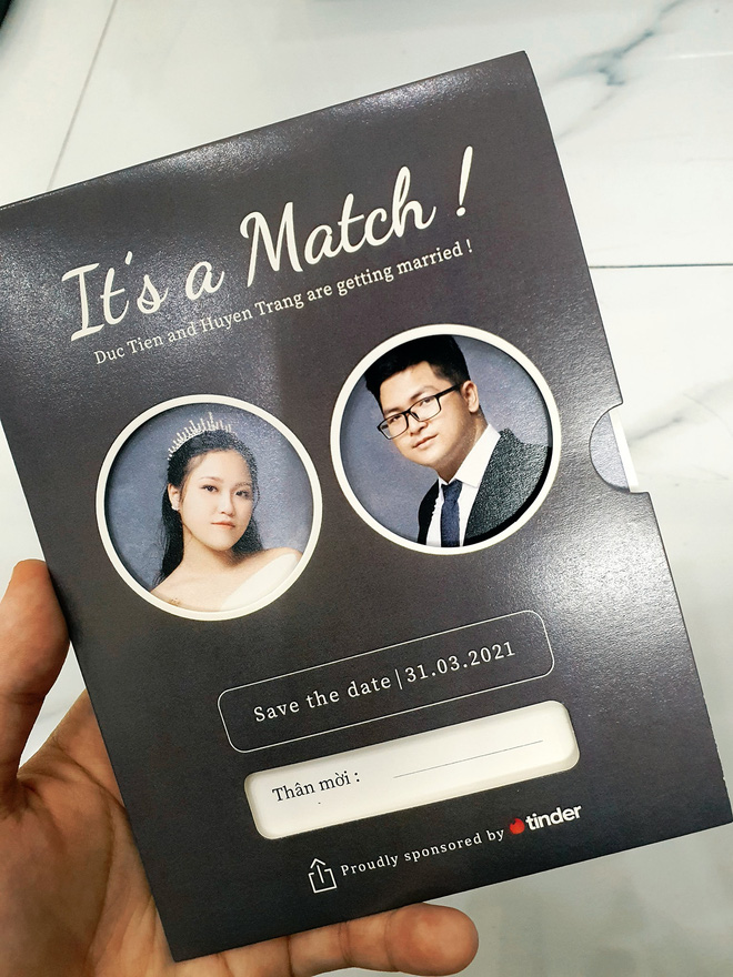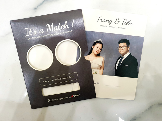 Một điểm khiến dân mạng chú ý và thích thú chính là chiếc thiệp cưới được chính tay Huyền Trang - vốn tốt nghiệp Thiết kế đồ họa thực hiện. Nhìn tấm thiệp, người ta có thể thấy ngay sự sáng tạo và đặc biệt là nhấn mạnh phong cách kiểu Tinder - như một lời cảm ơn mà đôi bạn trẻ gửi đến "bà mai" mát tay này.