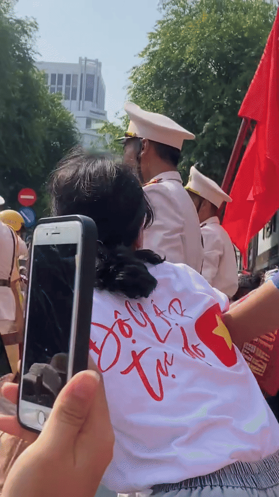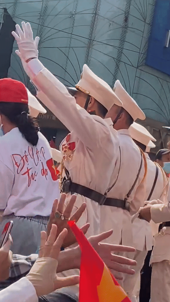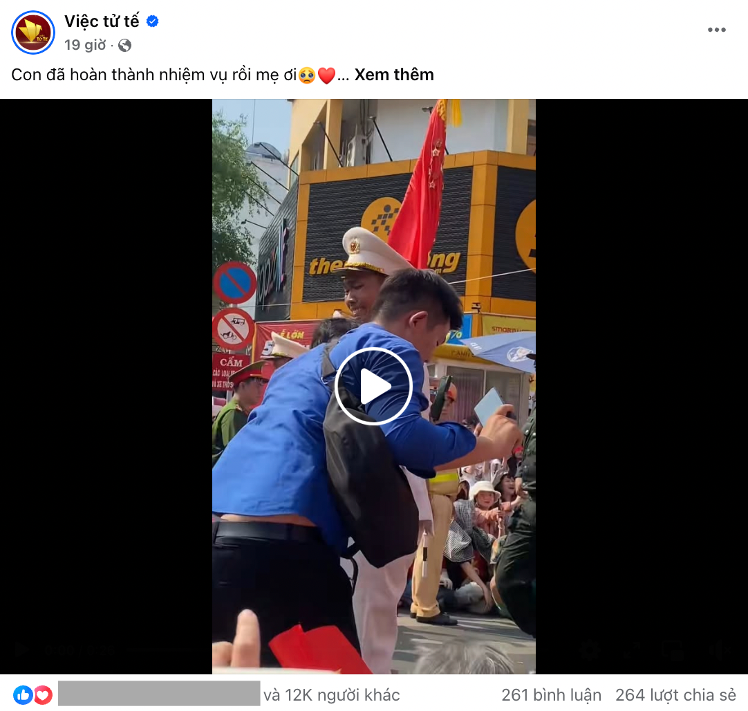 Trong đoạn clip, chiến sĩ xuất hiện trong đội hình diễu binh Khối nam Sĩ quan công an TP.HCM. Sau khi hoàn thành nhiệm vụ, anh cùng đồng đội di chuyển về địa điểm tập trung và được người dân 2 bên đường chào đón nhiệt tình. Bất ngờ, nam chiến sĩ nhìn thấy mẹ ngồi ven đường nên đưa 2 tay ra ôm, lúc này gương mặt anh đã khá xúc động.