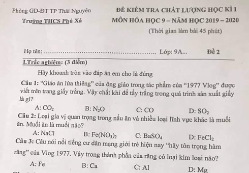 Một đề thi học kỳ I của Trường THCS Phú Xá (ở Thái Nguyên) vừa được chia sẻ trong một hội nhóm Facebook thu hút sự chú ý của nhiều người bởi sự xuất hiện của hiện tượng "1977 Vlog". Cụ thể, đề thi Hóa học có 2 câu hỏi liên quan đến "hiện tượng 1977 Vlog" như sau: "Giáo án lửa thiêng của ông giáo trong tác phẩm của 1977 Vlog được viết trên trang giấy trắng. Vậy chất khí để tẩy trắng trong quá trình sản xuất giấy là gì?..."; "Câu nói nổi tiếng cư dân mạng giới trẻ hiện nay "Hãy tôn trọng hàm răng" của Vlog 1977. Vậy trong thành phần của răng có kim loại nào?...".