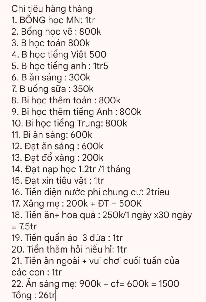 Với con thứ hai, tiền học thêm Toán 800 nghìn đồng, tiền học thêm tiếng Anh 800 nghìn đồng, tiếng Trung 800 nghìn đồng, ăn sáng 600 nghìn đồng. Con thứ 3 tiền học 1,2 triệu đồng/tháng, tiền ăn sáng, đổ xăng, tiêu vặt 1,8 triệu đồng. Tính thêm các chi phí chung cư, tiền ăn, quần áo, vui chơi... tổng số tiền chị phải chi hàng tháng là 26 triệu đồng.