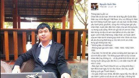 Ở đầu "Thông báo tuyển vợ", bác sĩ Nguyễn Quốc Bảo tự giới thiệu mình đang ở Việt Nam, khu vực Đông Á (Việt Nam là quốc gia Đông Nam Á) và "muốn làm quen với các bạn nữ độc thân, yêu hạnh phúc gia đình, cũng như những bạn gái yêu chân thật, muốn tiến đến hôn nhân,chia sẻ những buồn vui trong cuộc sống".