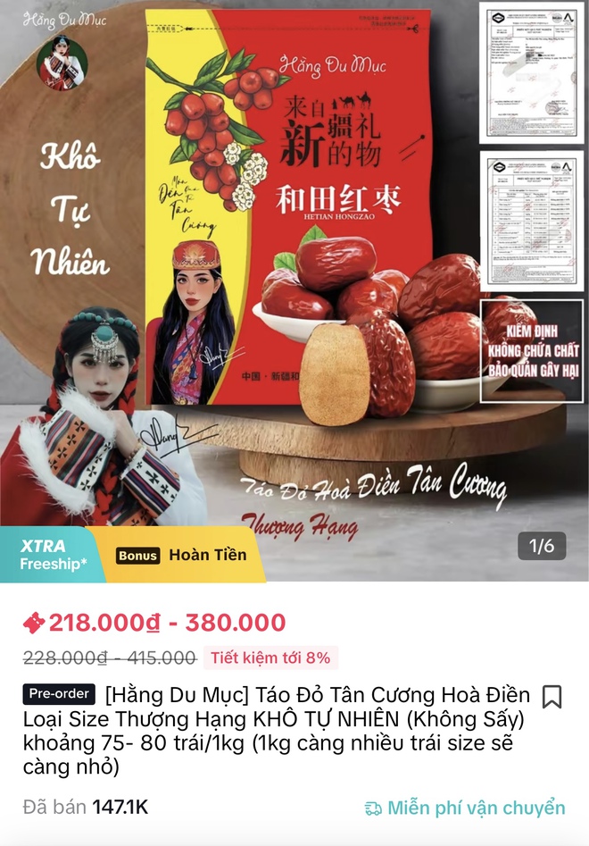 Trên sàn TikTok, Hằng Du Mục đã bán được hơn 147,1k sản phẩm táo đỏ, trong đó mỗi sản phẩm tương đương với 1kg táo. Mức giá gốc của mỗi kg táo là 228k và trong một số phiên live thì sản phẩm được giảm giá còn 218k. Tính "sương sương" thôi, tổng doanh thu cũng đã lên tới hơn 32 tỷ rồi. Chưa kể tới việc cô còn bán táo đỏ cả trên fanpage của mình thì có lẽ tổng lượng sản phẩm bán ra sẽ còn nhiều hơn rất nhiều.