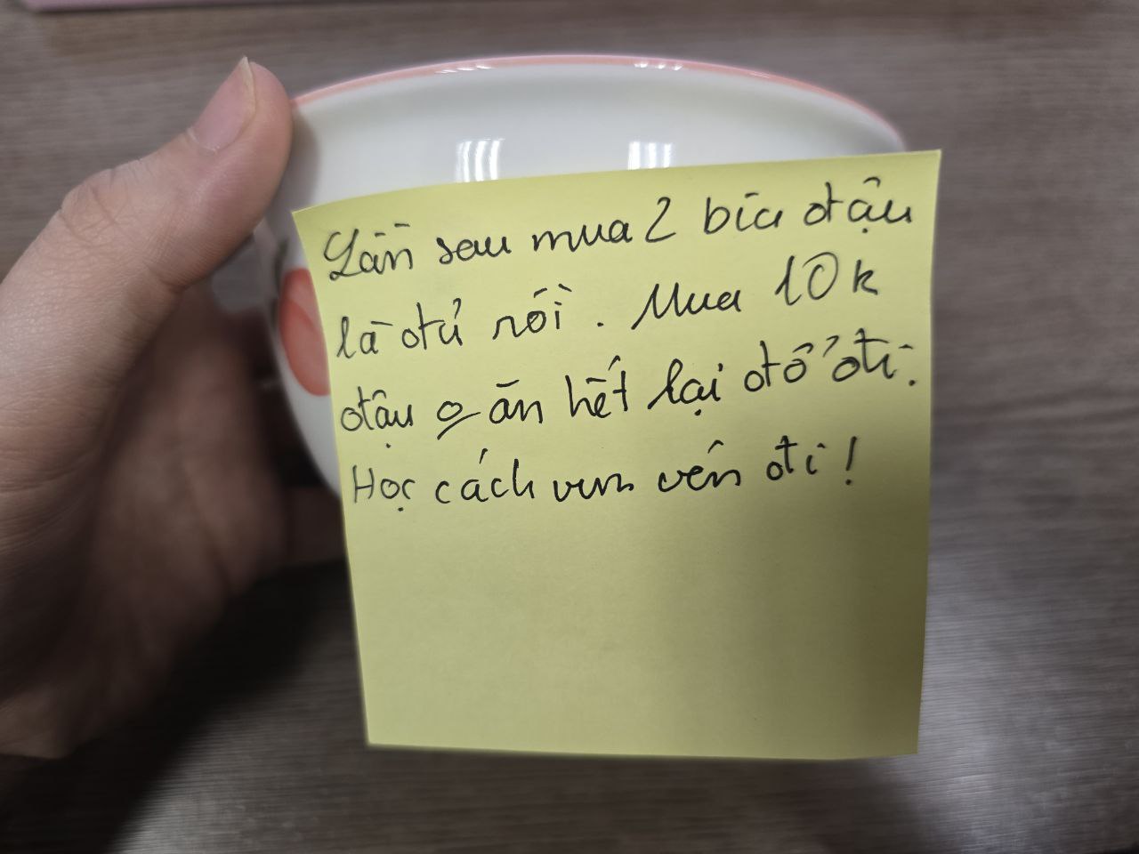Thậm chí, có lần chị Hạnh tỉnh dậy, xuống bếp thì nhận được tờ giấy chồng dặn dò chỉ được mua 2 bìa đậu với giá 7 nghìn đồng chứ không được mua 10 nghìn/3 bìa đậu phụ như mọi khi vì như vậy là không biết cách vun vén!