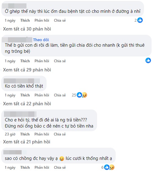 Bên cạnh đó, số khác khuyên người vợ không nên trông mong gì vào người chồng như vậy và nên tự chủ tài chính. Họ khuyên chị nên gửi con đi nhà trẻ hoặc thuê người trông con để đi làm, tiền thuê người sẽ về chia đôi với chồng.