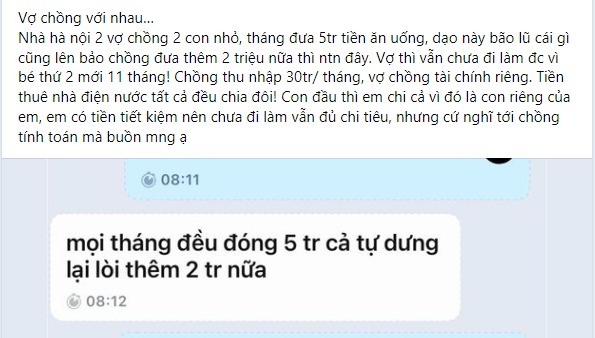 Hai vợ chồng sống ở Hà Nội. Từ khi kết hôn đến nay, hai vợ chồng chị đều tự chủ tài chính, tiền ai người nấy giữ, mỗi tháng người chồng sẽ góp 5 triệu để chi tiêu sinh hoạt trong nhà.