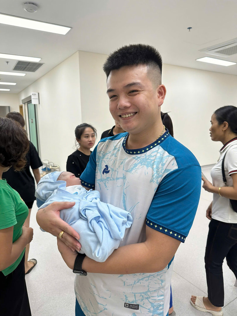 Sau gần 8 tiếng đồng hồ vật vã với cơn đau đẻ, vợ Hạnh hạ sinh con trai vào lúc 14h ngày 13/10. Con trai đầu lòng của anh chào đời với cân nặng 3,1kg, được đặt tên ở nhà là Bia.