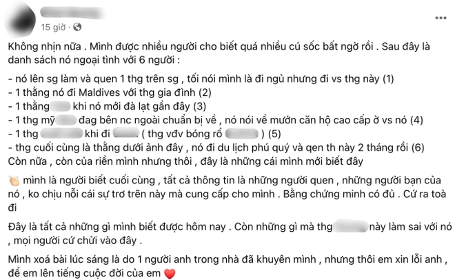 N.Q chia sẻ trên trang cá nhân: "Đây là những cái mình mới biết gần đây. Mình là người biết cuối cùng. Tất cả thông tin là do người quen và người bạn của nó (vợ) không chịu nổi mà cung cấp cho mình. Bằng chứng mình có đủ, cứ ra toà đi".