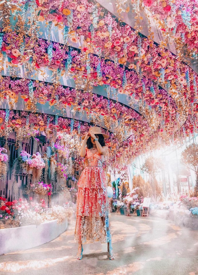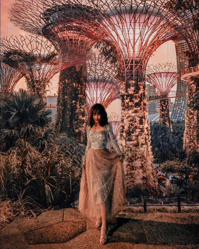 Đơn cử là bộ hình Mina Phạm đi Singapore hè vừa rồi, chụp tại Garden by the bay và sân bay Changi. Khung cảnh đã nhiều sắc màu rồi, ảnh còn được chỉnh lung linh hơn nữa, chèn đủ hiệu ứng ánh sáng, khói bay, nhũ kim…