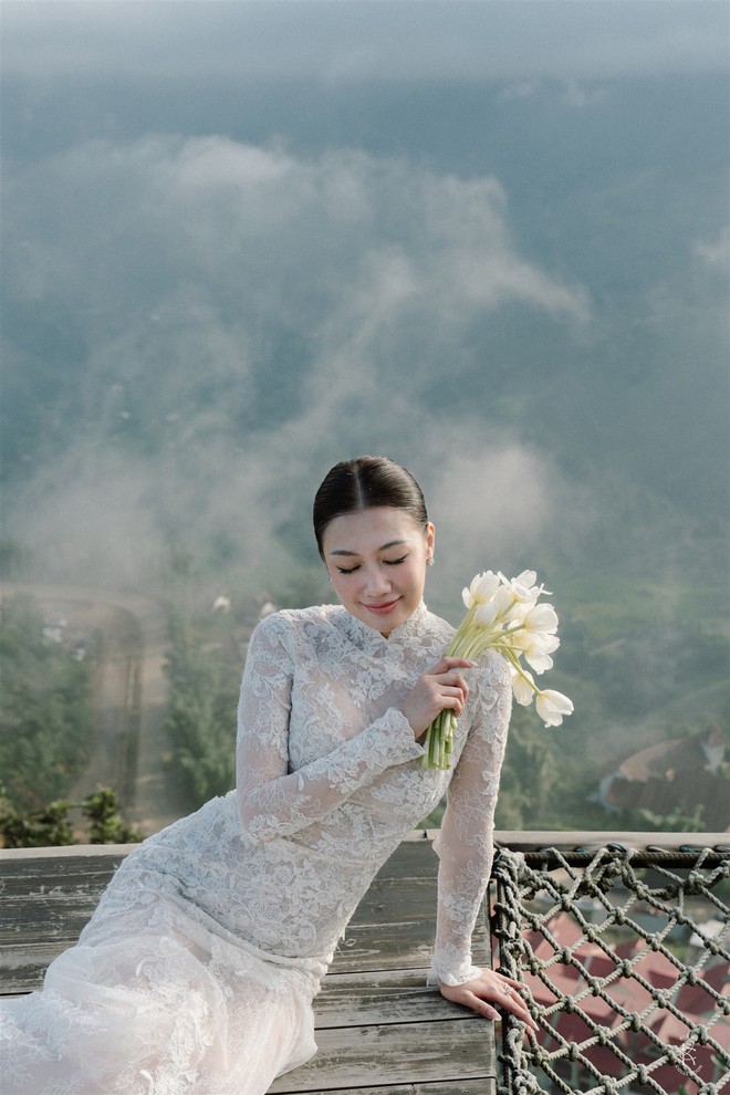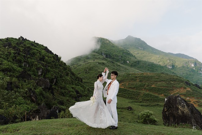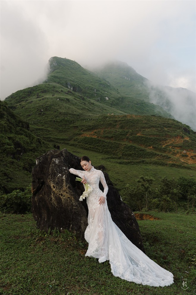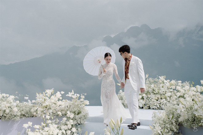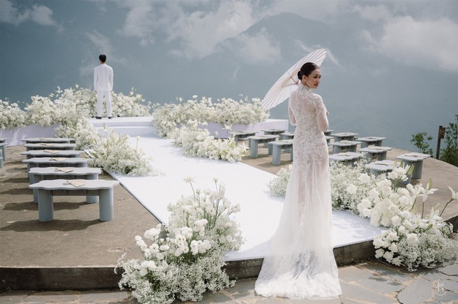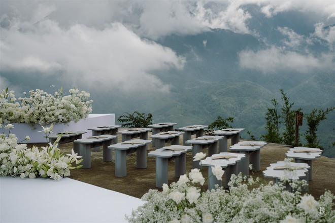 “Thử thách tinh thần lớn nhất với mình chắc là thời tiết. Bởi thời tiết trên Sapa đúng là test nhân phẩm. Vào buổi sáng hôm kết hôn thì trời đổ mấy cơn mưa rào, buổi chiều thì sương mù vẫn còn dày đặc. Nhưng thật may khi cô dâu và chú rể có màn first look thì gió thổi mây đi xa, đưa lại khung cảnh núi hùng vĩ phía sau”, cô dâu chia sẻ.