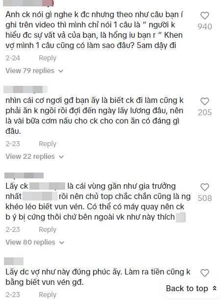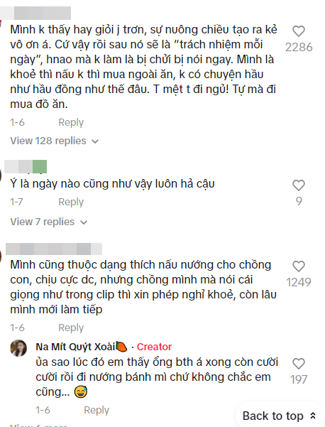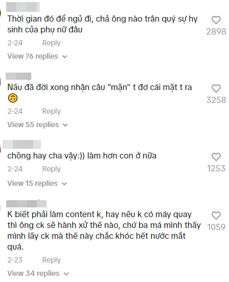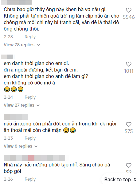 "Làm nội trợ dễ bị xem thường", "Ra đường giới thiệu là tiến sĩ được tôn trọng hơn nội trợ", "Chiều chuộng chồng quá tạo ra kẻ vô ơn", "Làm nội trợ không đóng góp gì được cho xã hội", "Phụ nữ phụ thuộc vào đàn ông chỉ có vậy"... cùng rất nhiều bình luận mỉa mai khác.