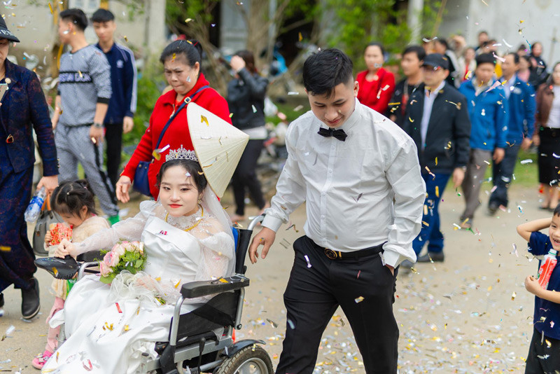 Chú rể dẫn đầu đoàn rước dâu khoảng 20 người từ Thanh Hóa vào Hà Tĩnh đón vợ. Khoảnh khắc cô dâu ngồi xe lăn cùng chú rể tiến vào lễ đường, cả hôn trường xúc động. Nhiều người rơi nước mắt mừng cho hạnh phúc của cặp đôi.