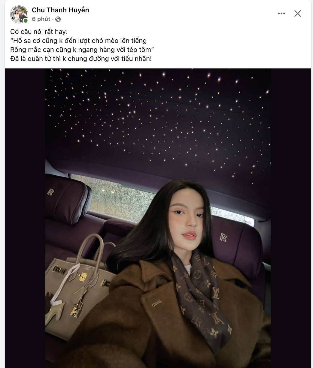 Thậm chí sau sự việc bị tố dùng hình ảnh con trai PR bất chấp, Chu Thanh Huyền còn gây chú với dòng trạng thái: “Có câu nói rất hay: ‘Hổ sa cơ cũng không đến lượt chó mèo lên tiếng. Rồng mắc cạn cũng không ngang hàng với tép tôm’. Đã là quân tử thì không chung đường với tiểu nhân”.