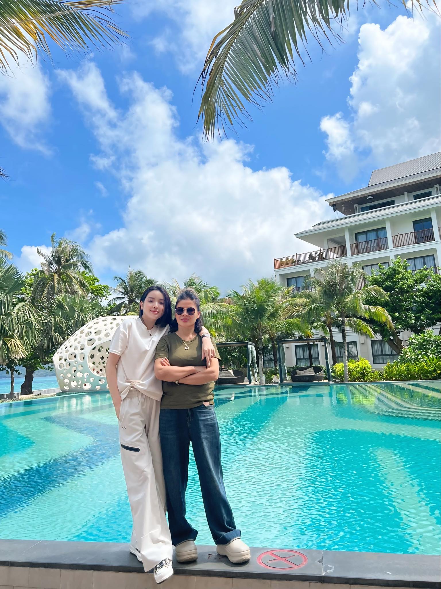 Không chỉ cùng mẹ chồng đi lễ, Chu Thanh Huyền còn tung ảnh check-in sảng chảnh cùng bà Cúc tại một khu nghỉ dưỡng cao cấp với hồ bơi xanh ngọc khiến cộng đồng mạng bàn luận không ngớt. Trong ảnh, Chu Thanh Huyền diện nguyên set đồ thể thao màu trắng với đường cắt tinh tế và sneakers đồng điệu, khoe dáng chuẩn mẫu và chiều cao lý tưởng, thì mẹ chồng lại chọn phong cách phóng khoáng với áo thun ôm sát và quần jeans tối giản, mix cùng kính râm cực "cool". Hai mẹ con tạo dáng sát cạnh nhau, ánh mắt và thần thái đều rạng rỡ, Chu Thanh Huyền khoác vai mẹ chồng toát lên vẻ gần gũi, khiến không ít người tưởng họ là bạn thân hơn là mẹ chồng – nàng dâu.