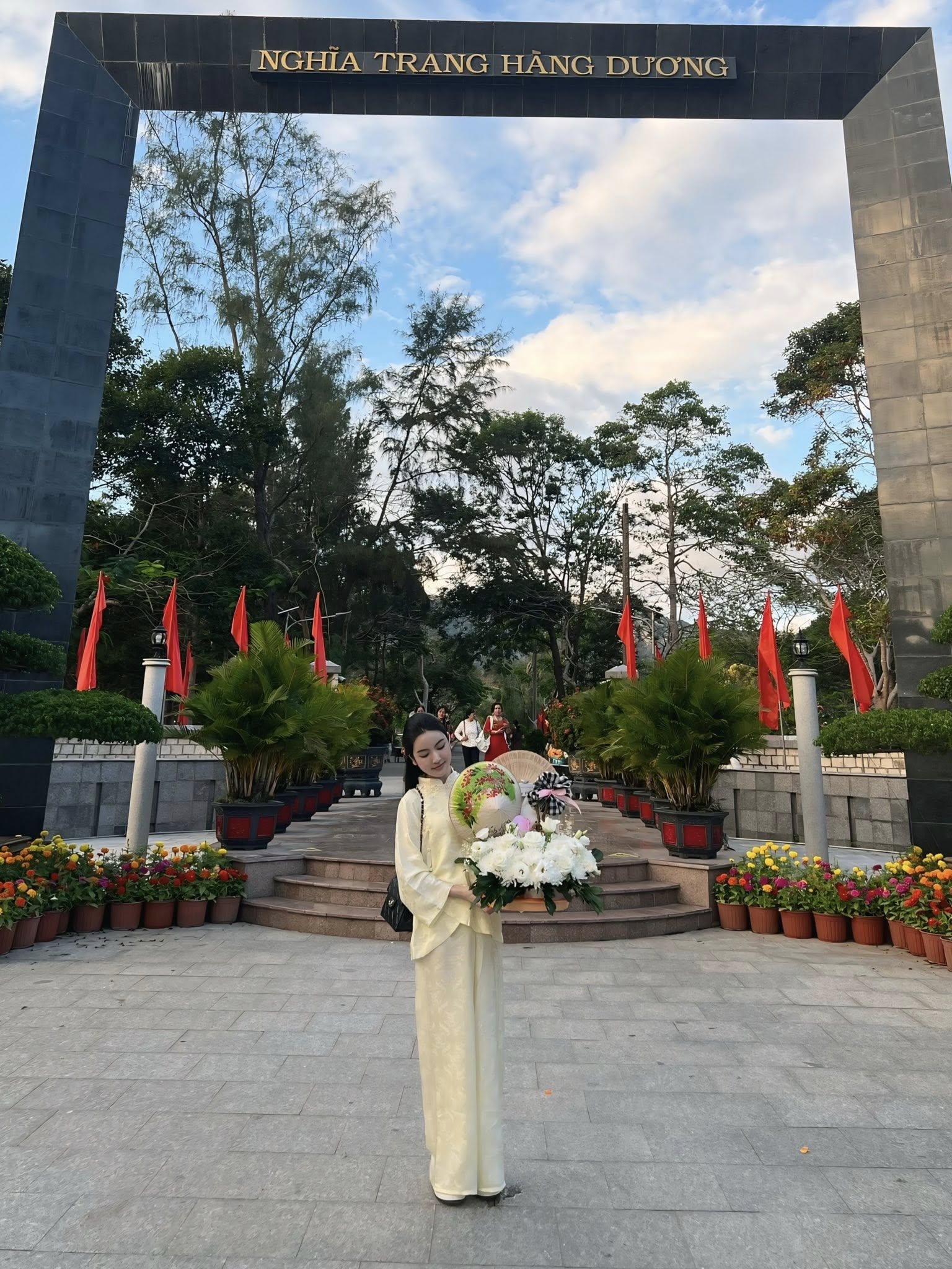 Trong những bức hình chụp trước cổng Nghĩa trang Hàng Dương – không gian trang nghiêm và đậm chất cổ kính, Chu Thanh Huyền - vợ Quang Hải - diện bộ pháp phục lụa vàng nhạt với họa tiết gấm chìm, tôn dáng và toát lên khí chất nhẹ nhàng. Mái tóc suôn dài, lối trang điểm trong trẻo cùng chiếc túi Chanel đeo khéo léo bên vai đem đến cho Chu Thanh Huyền phong thái vừa truyền thống, vừa hiện đại. Đôi mắt sắc sảo, sống mũi cao và gương mặt thanh tú khiến nàng WAG nổi bật giữa khung cảnh thiên nhiên xinh tươi bắt mắt.