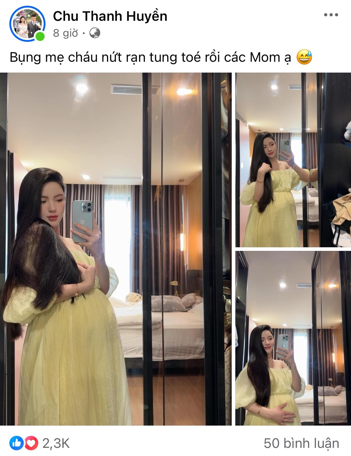 Dù mang bầu và đang bước vào giai đoạn những tháng cuối thai kỳ, Chu Thanh Huyền vẫn thường xuyên chia sẻ hình ảnh cuộc sống đời thường lên mạng xã hội. Trong bức ảnh được cô đăng lên trang cá nhân mới đây, Chu Thanh Huyền cho biết vòng 2 của mình đã bị rạn rất nhiều. Mặc dù vậy, nhan sắc của mẹ bầu này vẫn nhận được "mưa lời khen" từ cộng đồng mạng.