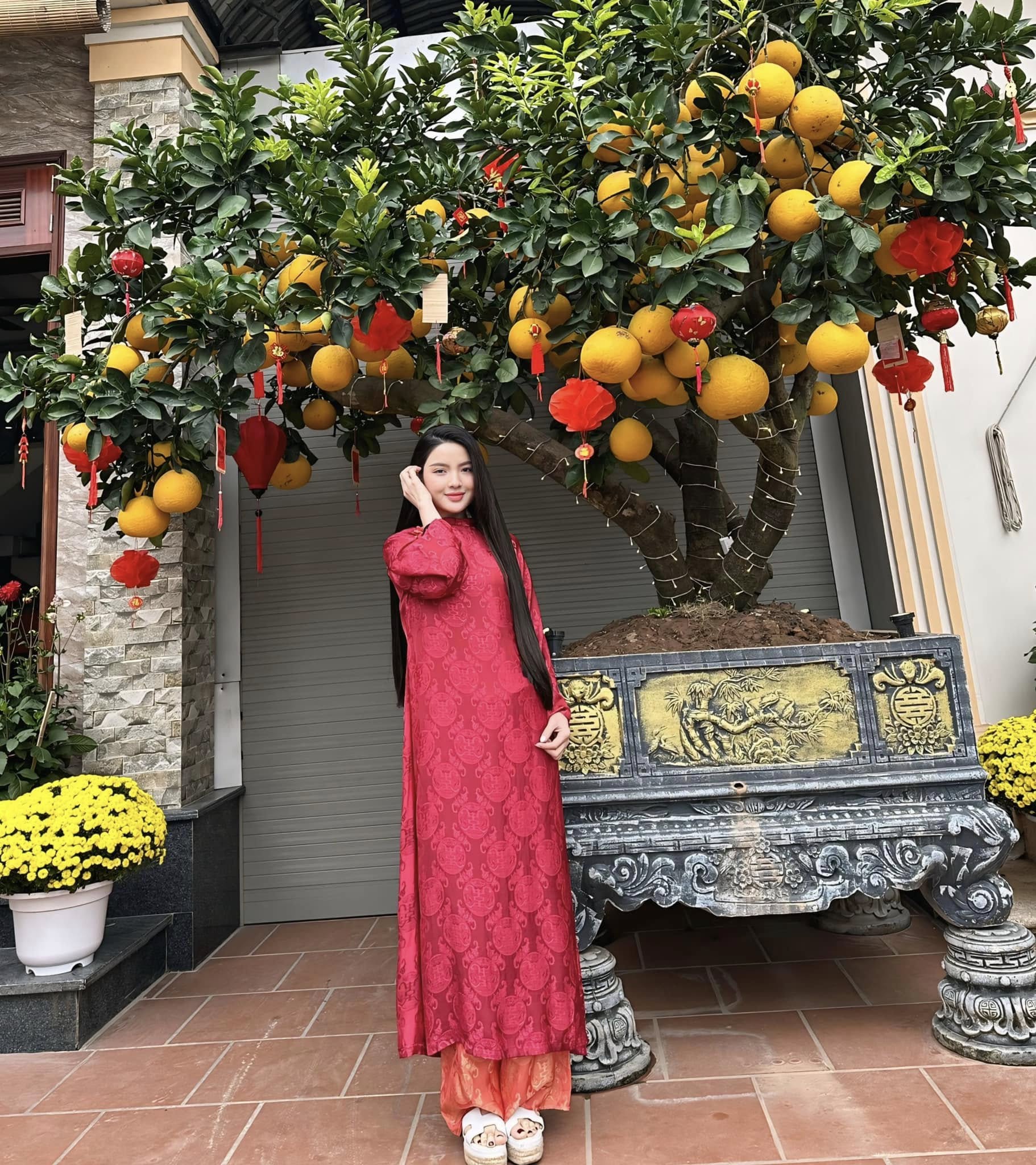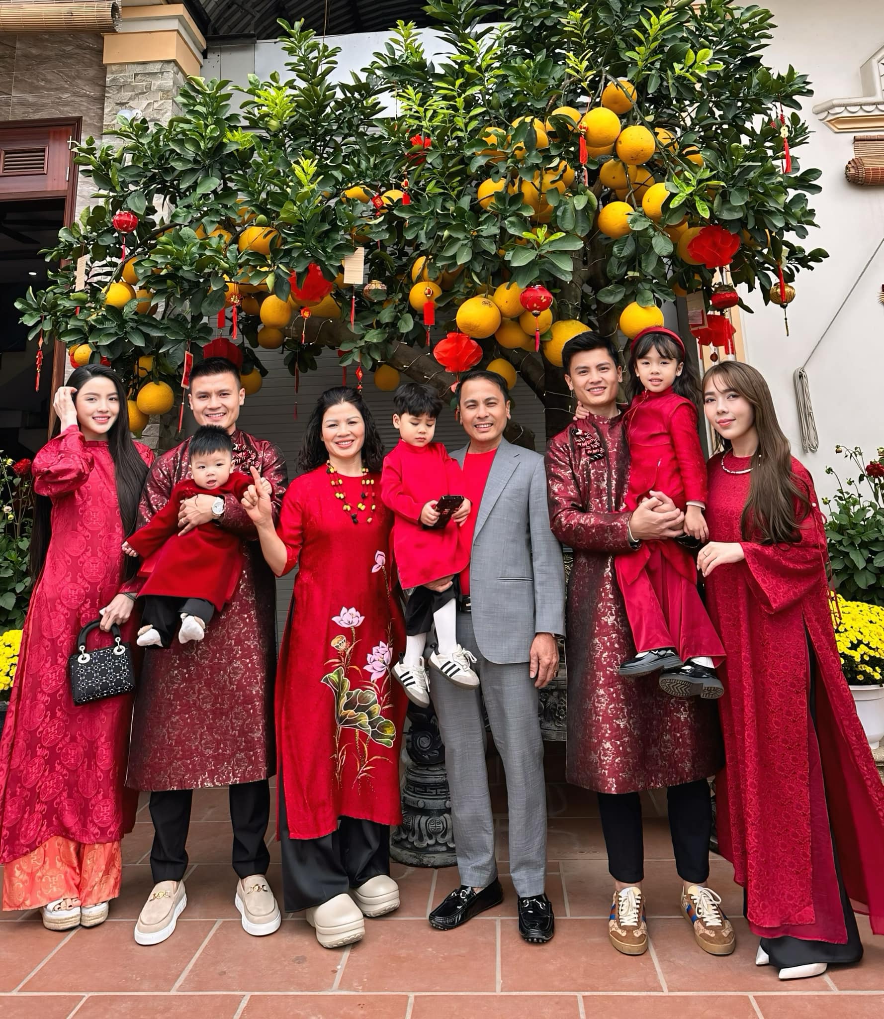 Trước đó, ngày mùng 1 Tết cả nhà Quang Hải cùng diện màu đỏ để cầu mong một năm mới gặp nhiều may mắn. Thanh Huyền mặc áo dài đỏ suông, để tóc dài trông nền nã, ngọt ngào.