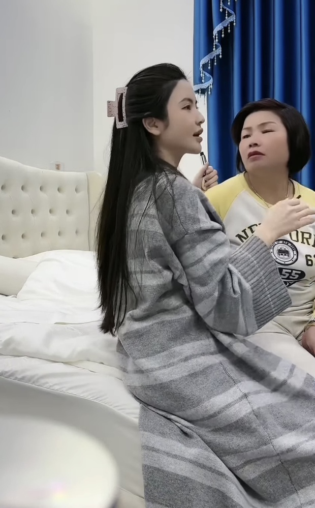 Sau lễ dạm ngõ, Chu Thanh Huyền chia sẻ trên mạng xã hội khoảnh khắc cô tất bật trang điểm cho mẹ để chuẩn bị đón gia đình nhà Quang Hải sang. Nàng WAG trang điểm cho mẹ nhẹ nhàng, chọn màu son môi giống với màu của mình sử dụng. Mẹ của người đẹp sinh năm 2000 cũng thoải mái ngồi chờ thành quả vì tin tưởng vào tay nghề của con gái.